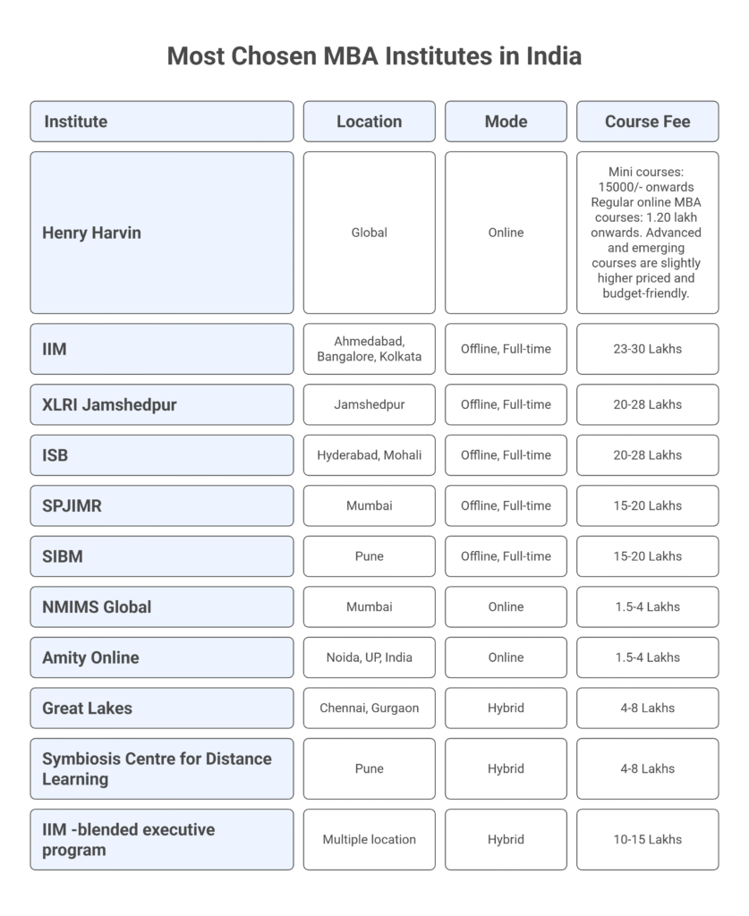 Henry Harvin has become a popular name among prominent online MBA colleges in India, with global accreditations and affiliations. They offer a range of courses from General MBA Courses to trending ones on emerging technologies. The table below shows the list of MBA courses available at Henry Harvin: